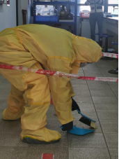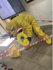 场景一:学生在进行实验时,滴加溶液操作不当,不慎稀盐酸溅入眼中,慌乱中打碎锥形瓶,瓶内溶液洒落。实验老师立即进行应急处置,学生用洗眼器洗眼后,送校医室进一步处置。实验老师同时上报应急总指挥,应急预案启动,应急救援组做好个人防护后,进行碎玻璃清理、泄漏液吸附、危废转移等工作。